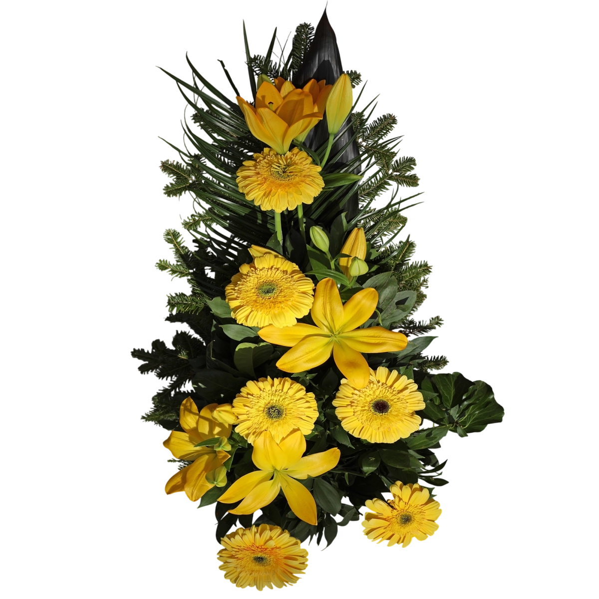 Gerberi unose svetlost i bliskost, dok ljiljani daju mir i svečanu notu, stvarajući kompoziciju koja deluje tiho, ali emotivno snažno.